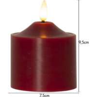 Flamme top är ett vaxljus i mörkröd färg. Ljusets storlek är ca 7,5cm i diameter och höjden inklusive låga är ca 9,5cm. Detta batteriljus blir en vacker dekoration, både ensam och i grupp ihop med övriga ljus från vår Flamme serie. Det har timerfunktion och när brytaren är på timerläget lyser ljuset i ca 30 dagar med en vacker realistisk låga i varmvitt. Det drivs av 2 AA batterier, dessa ingår ej. Undvik att ställa ljusen i direkt solljus då de kan smälta och missfärgas av värmen.