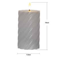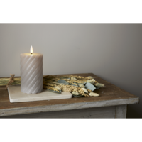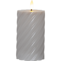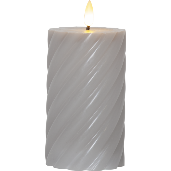 Twistat grått vaxljus i vår Flamme serie. Den naturtrogna lågan lyser med ett varmvitt sken. Med inbyggd timer. storlek på ljuset med låga 15cm. Undvik att ställa ljusen i direkt solljus då de kan smälta och missfärgas av värmen.