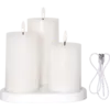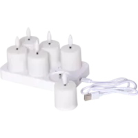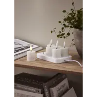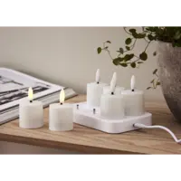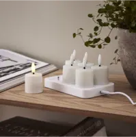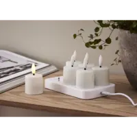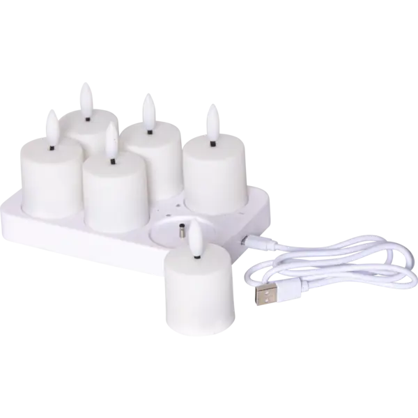Flamme Charge är ett set med 6st vita votivljus 4x6cm som är uppladdningsbara. Den tillhörande laddningsplattan har även en medföljande 80cm lång kabel med USB A-USB C kopplingar som enkelt går att kopplas in i en 5V adapter, adaptern ingår inte. Indikationslampan vid varje ljus lyser röd under laddning och grön när ljuset är färdigladdat.