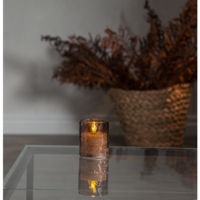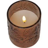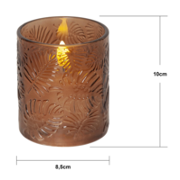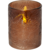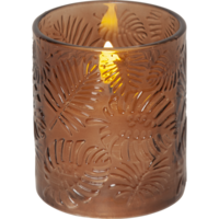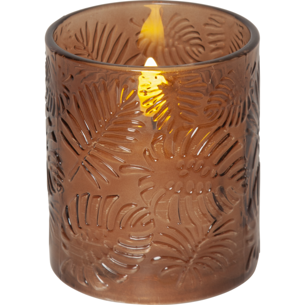 Flamme Leaf är en glaslykta med batteriljus gjord av brunt glas med lövmönster i relief runt ett vitt vaxljus. Ljuset är cirka 8,5 x 10cm. Detta batteriljus blir en vacker dekoration, både ensam och i grupp ihop med övriga ljus från vår Flamme serie. Det har timerfunktion och när brytaren är på timerläget lyser ljuset i ca 30 dagar med en vacker realistisk låga i varmvitt. Det drivs av 2 AA batterier, dessa ingår ej. Undvik att ställa ljusen i direkt solljus då de kan smälta och missfärgas av värmen.