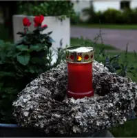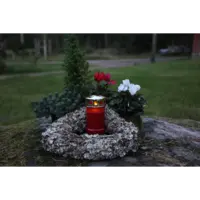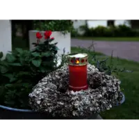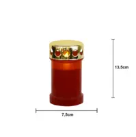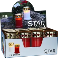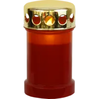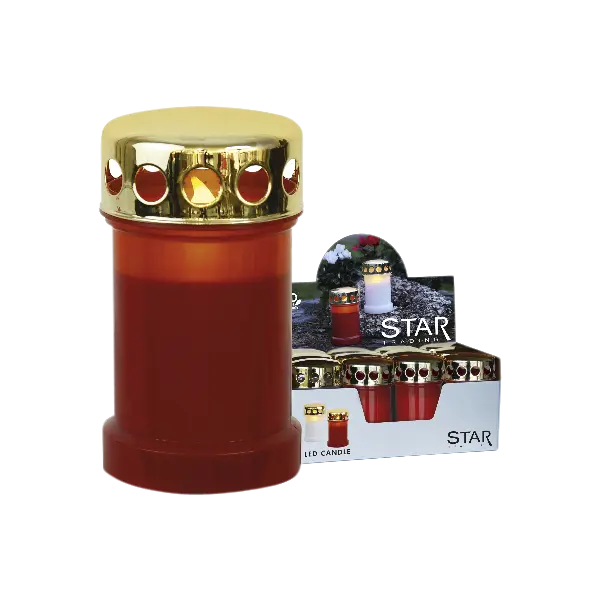 Display med röda gravljus. Ljusen är 13,5cm höga och i en display är det 12 stycken ljus. Dessa ljus har en extra lång brinntid, hela 1000 timmar.