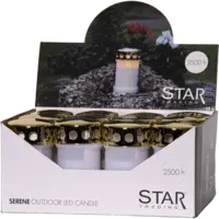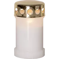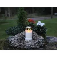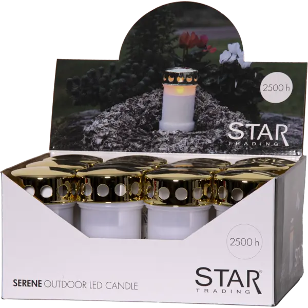 Display med 12 st vita gravljus. Ljusen är 13,5cm höga. Dessa ljus har en extra lång brinntid, hela 2500 timmar.