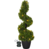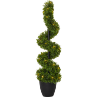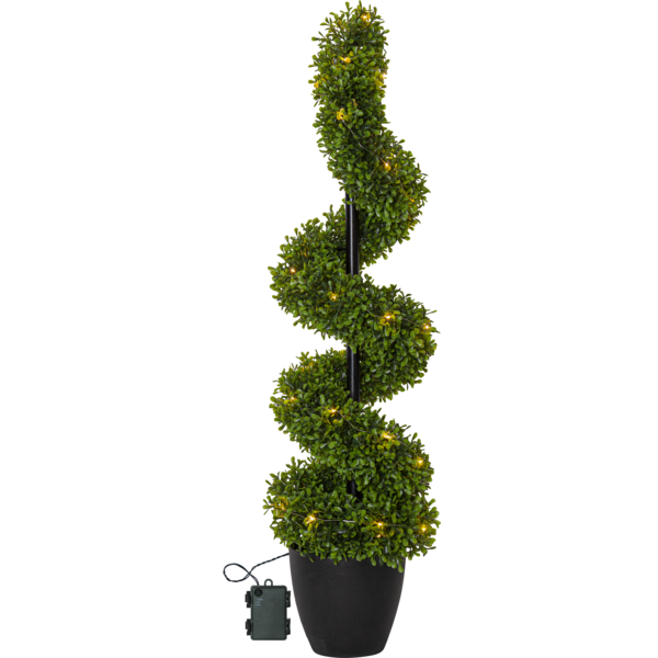 Buxbom spiral med höjden 90 cm är en konstgjord formklippt buxbom gjord av PE plast. Med 30 varmvita ljuspunkter lyser den vackert upp och går bra att använda som ett välkomnande träd utomhus eller inomhus i en lobby eller hemma i en hall. Den är vacker och naturtrogen och man slipper klippa om den varje år. Den drivs av 3 AA batterier och har även timerfunktion och när brytaren är på timerläget lyser trädet i ca 30 dagar. Den går bra att använda utomhus eller inomhus. Batterier ingår ej.