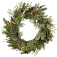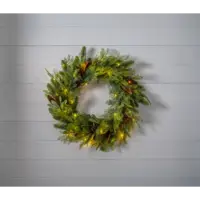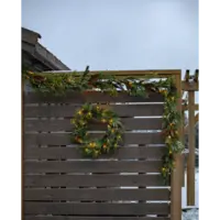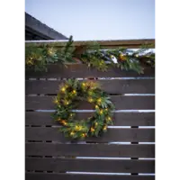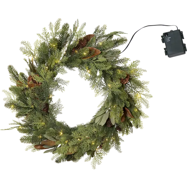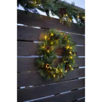 Kransen Mixi är gjord i en mix av löv och barr, gjorda i PE material ca 60 cm bred. Den blir vacker som dekoration på en dörr eller vägg. Med 30 varmvita dew drop lyser den upp med ett fint sken, slingan drivs av 3st AA batterier, dessa ingår ej. Kransen går bra att använda både utomhus och inomhus.