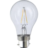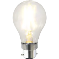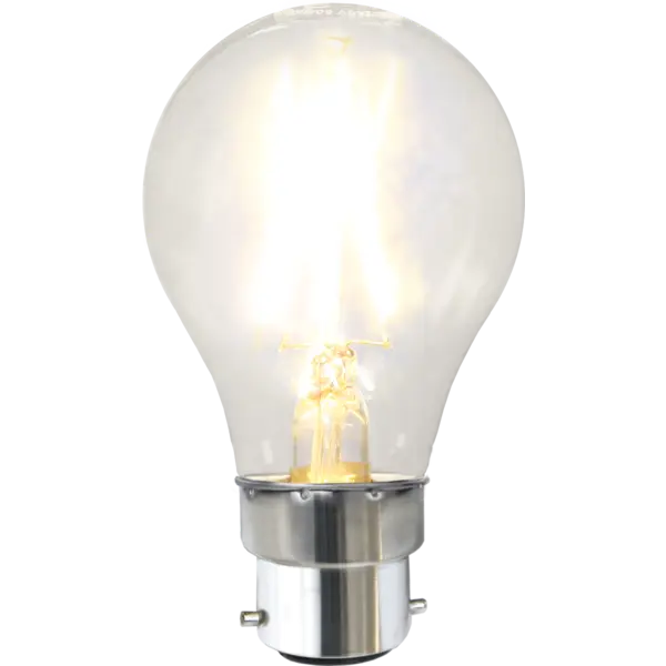 Normallampa LED med klart glas och B22-sockel. Färgtemperaturen är 2700K.