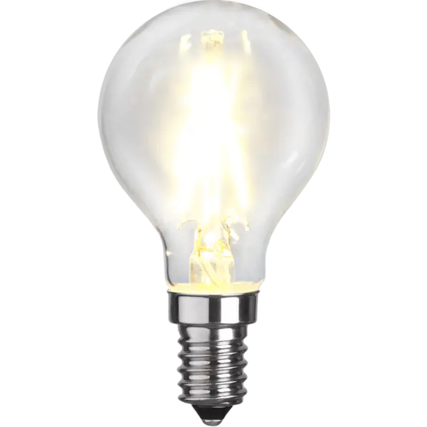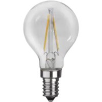 Klotlampa med LED, E14-sockel och klart glas. Färgtemperaturen är 2700K.