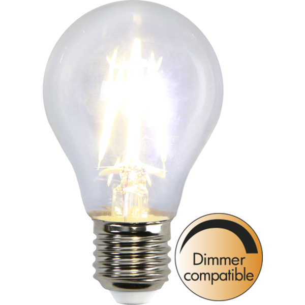 Normallampa med klart glas och E27-sockel. Färgtemperaturen är varmvita 2700K och lumen är 470. Ljuskällan är dimmerkompatibel och därmed kan ljusstyrkan justeras med en extren dimmer.