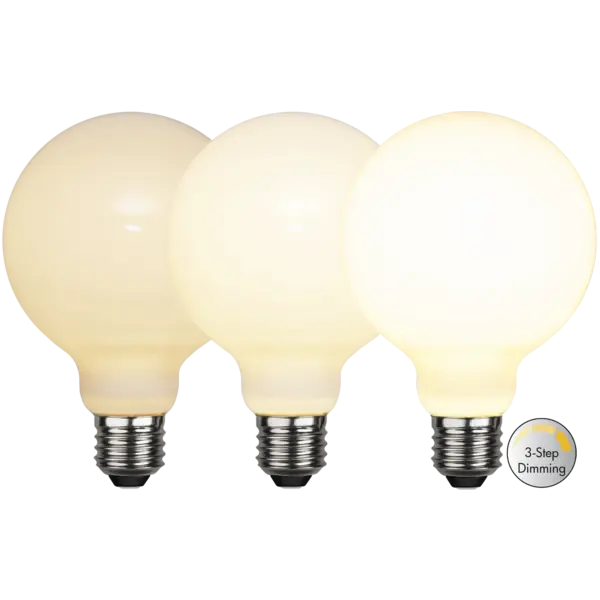 Opal lampa med 3-stegs klickdimring! Ljusstyrkan ändras enkelt genom slå av och på strömbrytaren. Välj mellan 80lm, 400lm eller 800lm. Ljusfärgen är 2700K och den har E27-sockel. Startar alltid på lägsta ljusstyrka.