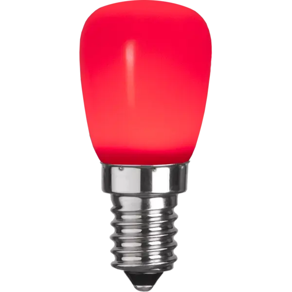 Röd päronlampa med E14 sockel och hölje av plast. Perfekt lampa till partybelysningen.
