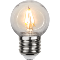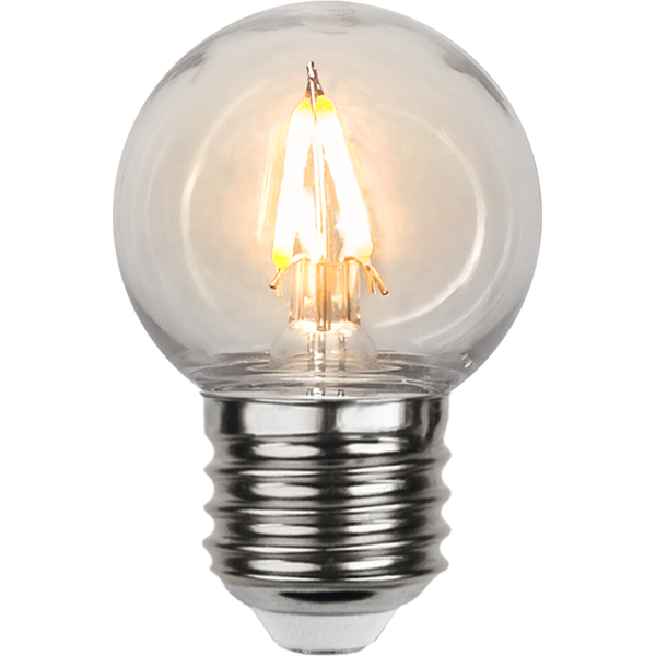 Ljuskälla i PC Cover att använda i din ljusslinga för att lysa upp din balkong, uteplats, pergola eller i partytält. Med ett av våra upphäng och skärm får du härligt mysig belysning över din matplats eller loungemöbel. Med ett ytterhölje av plast som håller bättre i lite tuffare miljöer och om du har husdjur eller barn. Ingen risk för glassplitter. Färgtemperaturen på 2200K och ljusstyrkan på 70lm ger det perfekta mysljuset. Star Trading har flera olika ljuskällor med plasthölje i olika ljusstyrkor och färgtemperatur. Här kan du mixa och matcha för att skapa rätt stämning för varje tillfälle. Denna ljuskälla kan användas ute men endast ihop med en armatur som är godkänd för utomhusbruk.