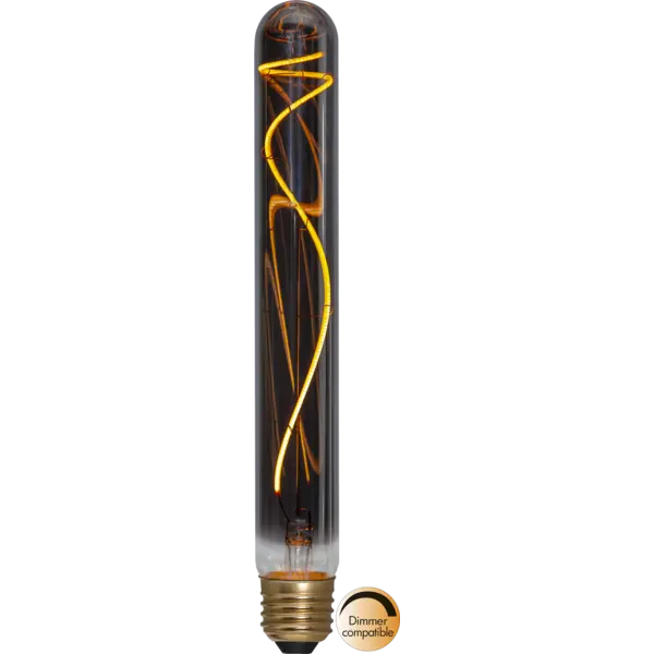 Tubformad ljuskälla med vackert rökfärgat glas och E27-sockel. Inuti finns en dekorativ spiral som ger ett vackert ljussken. Färgtemperaturen är behagligt varmvit, 2200K. Lampan är dimmerkompatibel för att enkelt kunna ge rätt ljusstyrka.