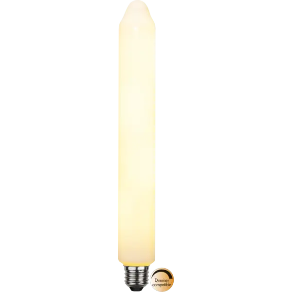 Dekorativ LED-ljuskälla med varmvitt sken och opalt glas. Färgtemperaturen är 2500K, sockeln är E27 och den är dimmerkompatibel.