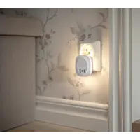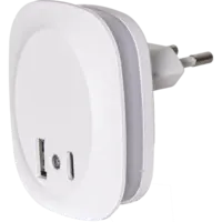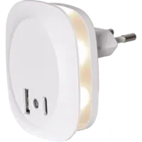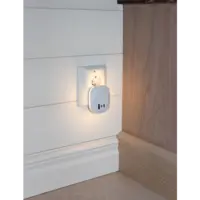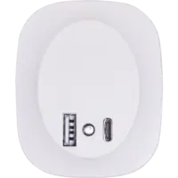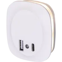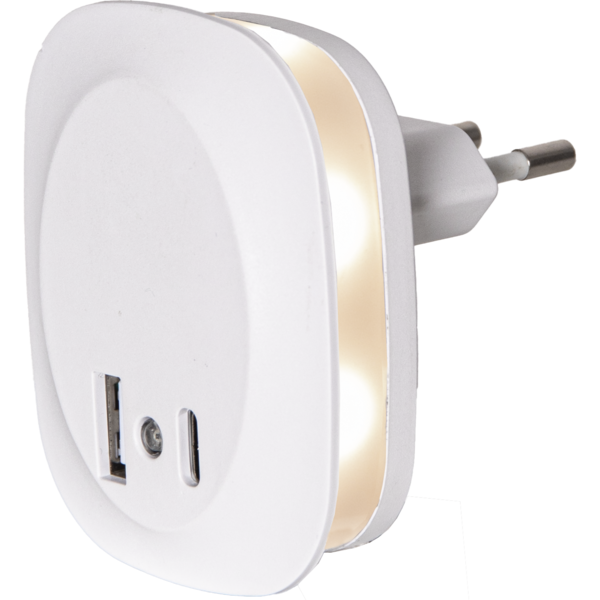 Nattlampa med skymningssensor och ladduttag för USB A-plugg och C-plugg, 5V/1A. Skymningsläge: Lyser runt om sidorna vid skymning/natt. Lampan lyser så länge ljusvärdet understiger 30 lux. Enkel att bara plugga in i ett eluttag.