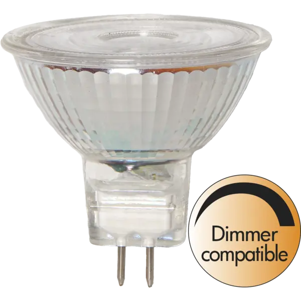 LED spotlight i glas. Sockeln är GU5,3, ljuset är varmvitt och den är dimmerkompatibel.
