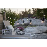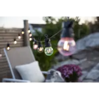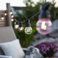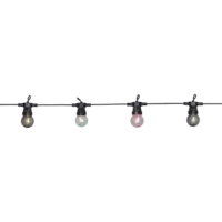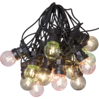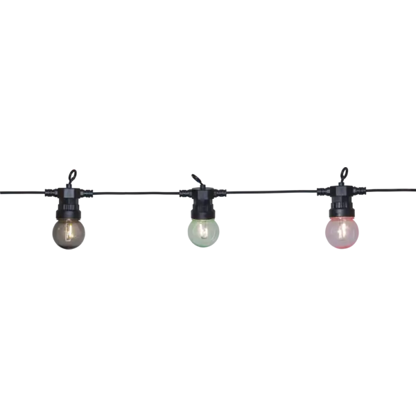 Partyljusslinga med transparent färgade höljen och 20 LED-ljuskällor med filament. Härlig ljusslinga att inreda med till vardags och fest. Ger ett vackert sken i mörkret. Svart kabel och med krokar över ljuskällan för enkel upphängning av slingan
