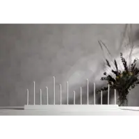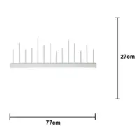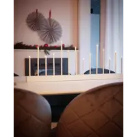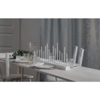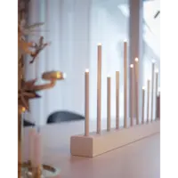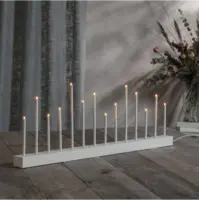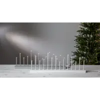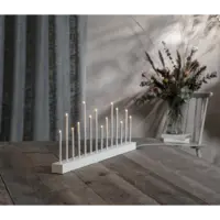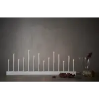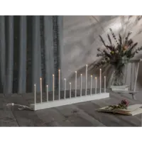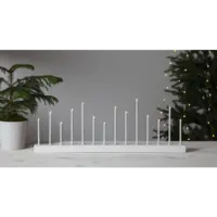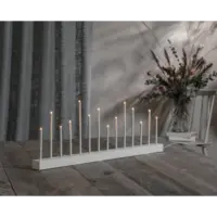 Stilig vit och enkel ljusstake, träbas med metallpipor, 14 ljuskällor. Spridar varm och behagligt ljus. Passar utmärkt att dekorera med till advent och jul men varför inte ha den kvar större delen av året då den också passar året runt. Ger ditt hem en modern touch.