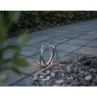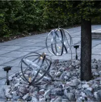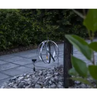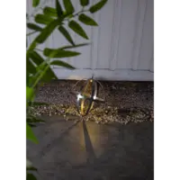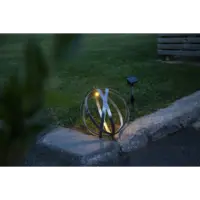 Solcellsdekorationen Astri är en trädgårdsdekoration som levereras platt men som man enkelt vinklar upp de 5 banden till en rund sfär. De 15mm breda banden har en silverantik färg. Under natten lyser den upp med en varmvit led som ger ett vackert skuggspel på marken. Astri går även bra att hänga upp i den fastsatta hängaren. Denna solcell blir en vacker dekoration och är lättplacerad i en plantering i trädgården eller på en balkong eller terrass. Själva paneldelen sitter med 1,5 meters kabel från dekorationen, detta gör det enkelt att placera panelen i direkt solljus vilket är nödvändigt för att ladda batteriet som medföljer.