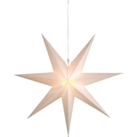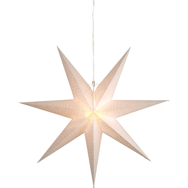 Mönstrad pappersstjärna i vit design. En vacker stjärna att dekorera med i fönstret. Stjärnan har plats för en ljuskälla. Höjden är 100cm.