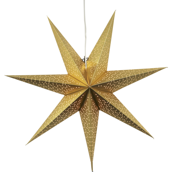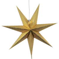Mönstrad pappersstjärna i färgen guld. En vacker stjärna att dekorera med i fönstret. Stjärnan har plats för en ljuskälla. Höjden är 70cm.