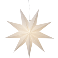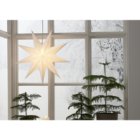 Vit pappersstjärna med hålmönster i form av en stjärna. Dekorera med till jul och advent. Häng en eller flera stjärnor tillsammans i ett fönster eller mot en vägg. Stjärnan har plats för en ljuskälla och det följer med ett upphäng för E14 lampa. Denna produkt har FSC®-märkning.