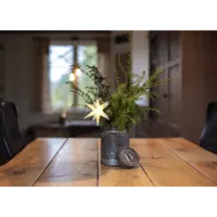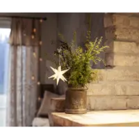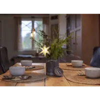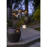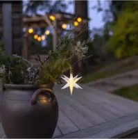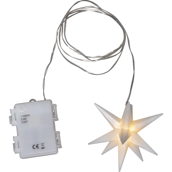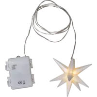 Batteridriven mini 3D stjärna för utomhusbruk och inomhusbruk. Lyser med varmvitt sken från den inkluderande LED lampan. Den inbyggda timern gör det lätt att ställa in när stjärnan skall lysa. Lyser stämningsfullt i trädgården och ger en härlig jul och vinterkänsla både inne och ute.